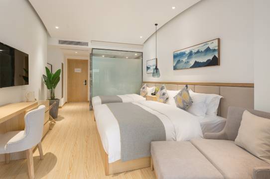 客栈占地1800方,房间宽敞明亮,设施设备齐全,房型能满足各类到此旅行游客下榻居住,是您炎炎夏日的避暑胜地。客房以色调为主,将简欧混搭装修风格运用到了其中,浅色的木质地板,看宽敞的放松空间和力求让每间房都能沐浴阳光的布局,打造出最舒适的睡眠环境。蓝色的玻璃灯盏,恰到好处的化解了客房的冷硬氛围,增添了几分文艺清新之感。干湿分离的的独立卫浴格局增加了客房的实用性,细节处理上更加贴心。