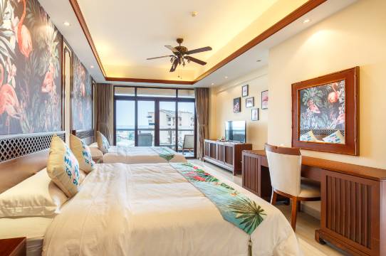 临高裕和温泉度假公寓,座落于海南省海口市临高博厚镇碧桂园金沙滩温泉度假酒店,酒店拥有海滩、儿童游乐设施。本公寓以家庭度假居住为主,分别有冰雪奇缘、Hello kitty 、变形金刚、魔法奇缘、海底世界、温馨火烈鸟等15间儿童主题房,深受孩子和居家朋友的喜爱。房间适合2-4人居住,每间房均配备2张1.8米或1.5米的双人大床,另配备电视、空调、三门冰箱、洗衣机、热水壶、电磁炉、抽油烟机、热水器、无线网络、一线海景观景阳台。酒店不仅居住舒适,而且生活十分便利,酒店楼下有超市、菜市场、餐厅,日常生活用品、食品一应俱全,并且沙滩边早上7点有渔船新鲜打捞的海鲜,非常适合家庭常住。预定前请客官先咨询是否有房,谢谢合作。