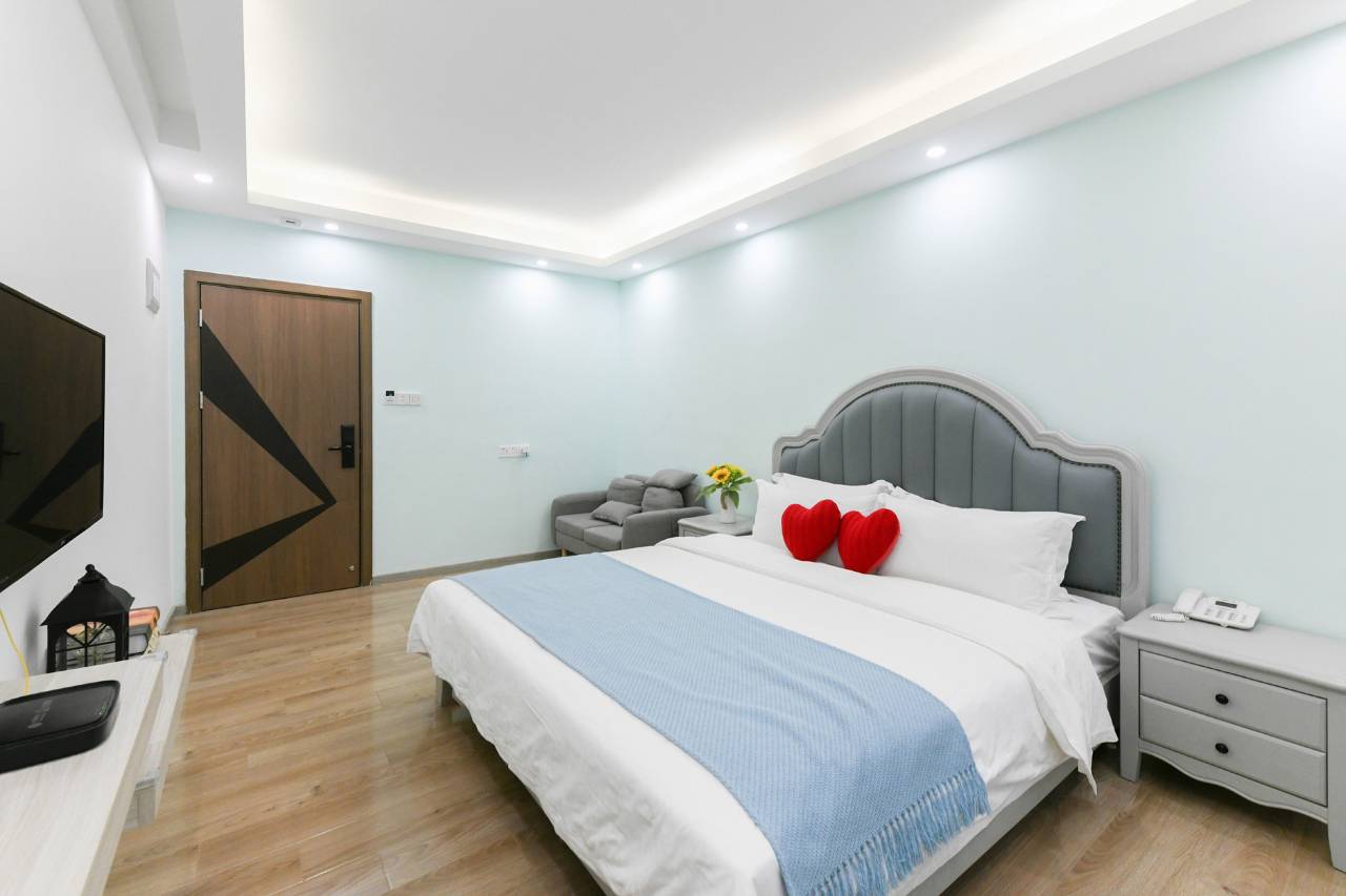 装修理念风格是釆用民宿加现代、中西相结合的模式,一楼及公共区域以中式民宿风挌为主,客房侧设有九种风情系例(地中海、夏日清新、日式榻榻米、重古、轻古、现简、北欧、简欧、大红),任何旅客进来总有一款合式。
