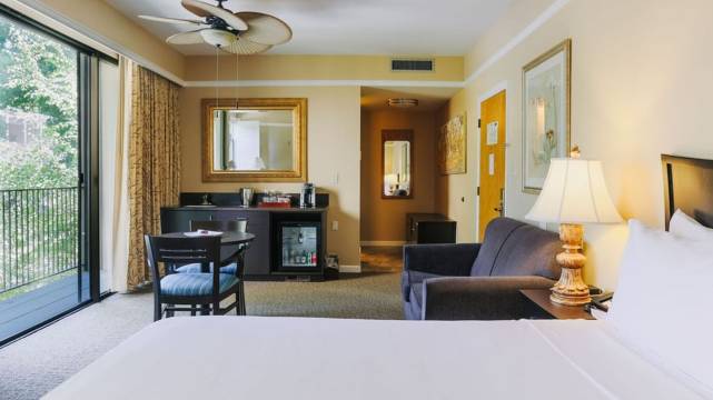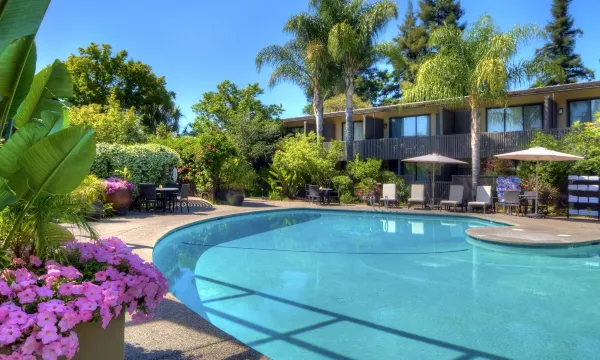 非常温馨,安全,安静的酒店,免费停车,酒店内绿树环绕,好几棵很粗很高的红杉树。酒店房间窗外就是干净清澈的水池,有锦鲤还有一只鸭子,哈哈。酒店有个小泳池,亲子游不错。房间很整洁精致,床很舒适,是非常满意的一次住宿体验。