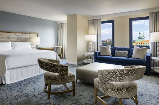 酒店房间很新很干净!去各个园很方便,不是有穿梭吧就是有船到。很喜欢也很惊喜有这么舒服。住了四晚,其中有两天玩累了还中途回来休息补给。点外卖也方便。打车去超市买吃的去奥莱购物都方便。非常推荐!本来11点退房的,我想延多一小时,去前台申请还免了40刀费用。
