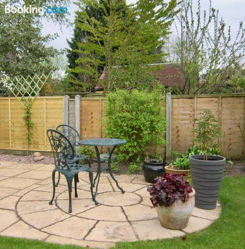 这家度假屋提供1间卧室、1间浴室、床上用品、毛巾、带卫星频道的平板电视、用餐区、设施齐全的厨房以及花园景露台。1间浴室配有淋浴设施和洗衣机,也配有免费洗浴用品和吹风机。