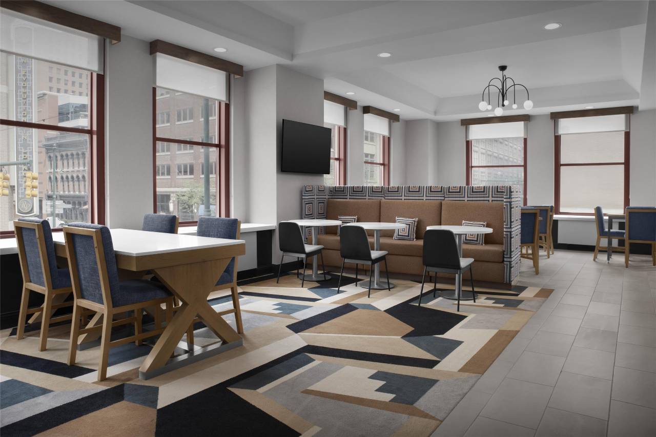 您可以到服务印第安纳波利斯市中心圆形中心对面希尔顿欢朋酒店住客的小吃吧/熟食店随便找点吃的。周一至周五 06:00 至 09:00 提供免费的全套早餐。