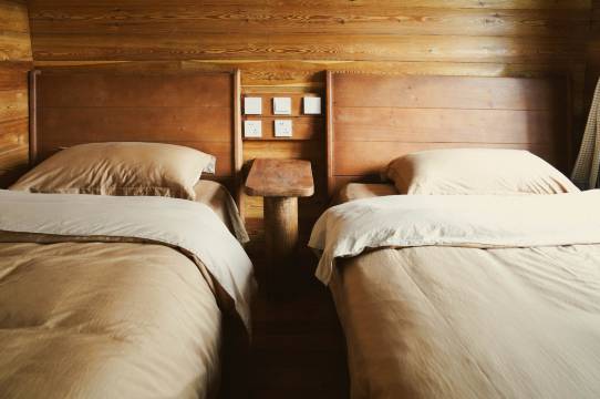非常可爱温馨的小木屋,散发着木香。厚实的原木做的床,干净舒适的床品,让人睡得非常安稳。此外 还有一个小阁楼,一家人来住,会非常好