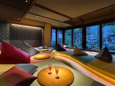酒店内部采用传统的日式设计,中央有一个美丽的花园,景色令人叹为观止。酒店门前还有一个足浴区,增添了一丝当地风情。