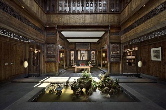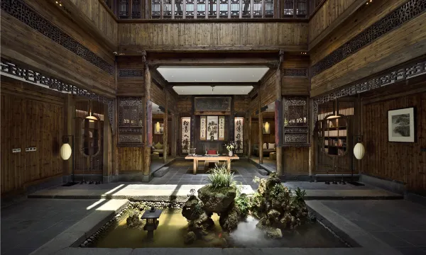 酒店占地十余亩,背山临水,独具特色的徽州民居风格,跨跃明清两时代的老建筑,有气势恢宏的木雕楼,有十多处独具特色的园林景观,让您置身其中流连忘返。