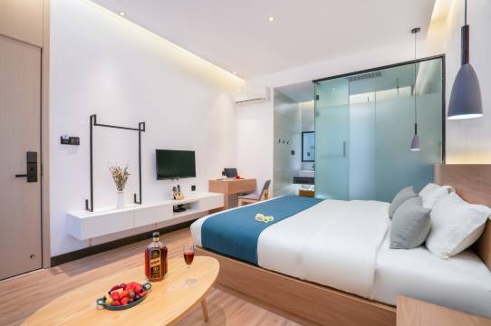 酒店环境舒适 简约轻奢风让人一眼就感觉舒适大气 卫生干净 晚上也很温馨 这种设计风格在本地也是独一家了 老板人很好很热情 前台也很客气 还给推荐附近好吃的好玩的 还会再来!!!