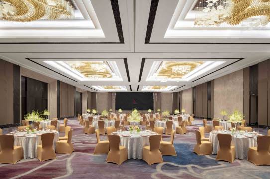 总面积3,000平方米的宴会及会议空间,包含1,100平方米的无柱豪华大宴会厅及9间多功能厅。宴会厅拥有6米的挑高空间并配备高清LED大屏,卓越典雅的格局与华丽辉煌的设计,齐全且高品质的影音设备。