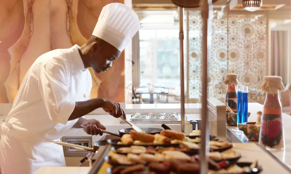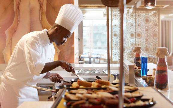 早餐服务是另一个亮点。品种和质量无与伦比,从新鲜出炉的可颂面包和现点现做的煎蛋卷,到煎饼、新鲜奶酪、橄榄、面包、水果和每日特色菜,应有尽有。早餐的工作人员非常棒,总是细心周到、热情好客,随时准备满足各种需求。特别感谢 Roaa Ahmed、Faisal、Usman、Imtiyaz 和 Alam,以及餐厅经理 Abdul Aziz 和厨师 Sameh,他们超越期望,甚至为我准备了特别的沙威玛,并送了免费的欢迎礼品到我房间。Abdul Aziz 兄弟亲自确保我整个住宿完美无瑕。