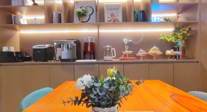 大堂醇香现磨咖啡、自助茶饮及水果小零食: