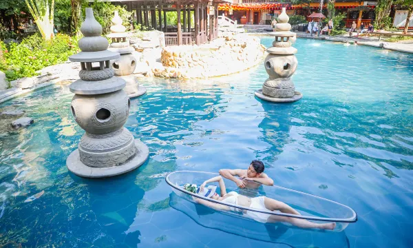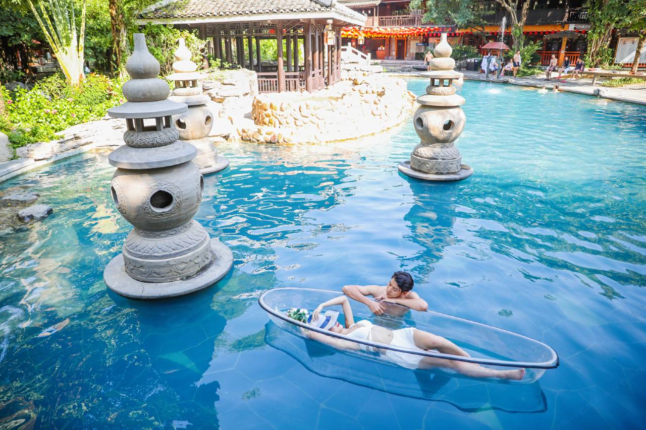 步入度假村,7栋风格各异的别墅楼掩映于绿林里,别墅里带有独立的室内外温泉泡浴池。这里的温泉是罕见的重碳酸钠型氟热矿水,有鲜花浴、百草浴、矿砂浴、泡泡浴、按摩池、SPA水疗池等。桑拿浴、蒸汽浴、光波浴和冰蒸浴搭配壮、瑶中医特色按摩,也是一大特色。
