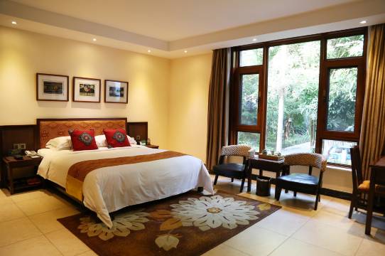 房间不是很大,在别墅一楼,挺不错的。特别好的一点是住店可以进出温泉两次,很划算。带小孩子泡不久,下午泡了两个小时就出来了,晚上又去了一次,玩得很开心。 桑拿啥的都有,挺好的。