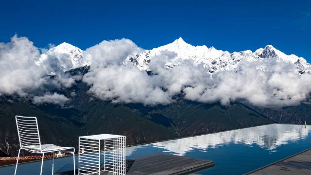 客房内都有面对雪山的大落地窗和观景阳台,顶层还有观景露台及镜面水池。