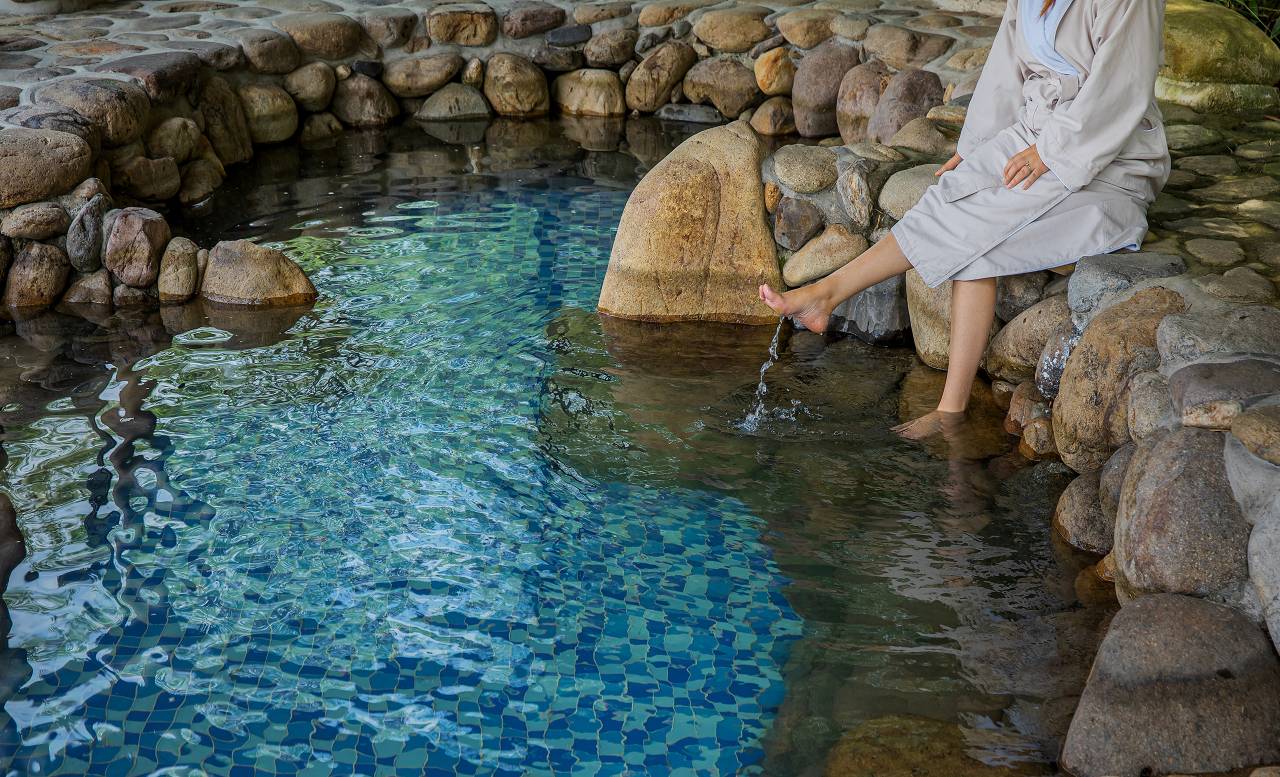 绕到后面有一个游泳池和一个温泉。现在天气热,温泉没有开。我只在泳池边上坐了会儿,池水很干净,还有皮划艇可以玩,背后就是山景,也很出片,而且清静,不用人挤人。
