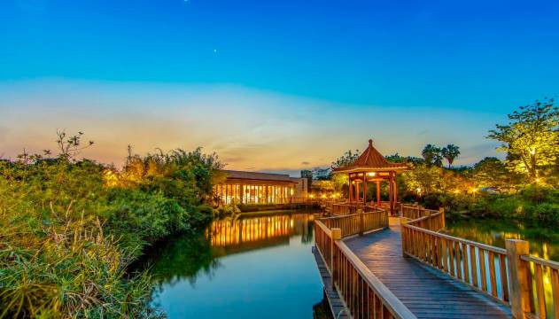 酒店占地100多亩,依深山神谷、临长水竹溪;结构布局遵循“山水融合、回归自然”的理念,以现代建筑风格融入东方园林建筑精髓,凸显岭南地域特色文化。