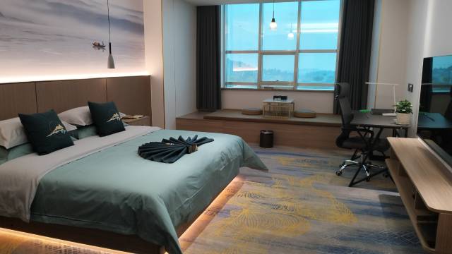 房间很大很干净,前台服务很热情,坐在窗前喝着茶,很是放松,酒店周围是山脉环绕着,风景秀丽,入住很高兴很舒服,早餐很很丰富,去青州一定要定这家。