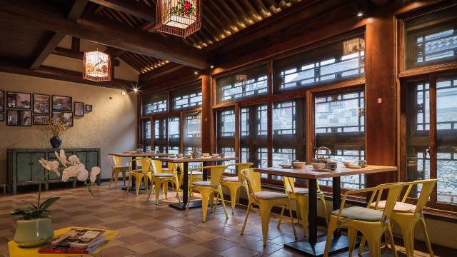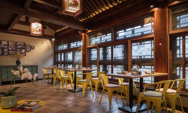 客栈是以大床房为主的中式风格,别致的庭院,推开窗会看到人们在岸边闲庭信步,夜幕降临,水镇夜景尽收眼底。