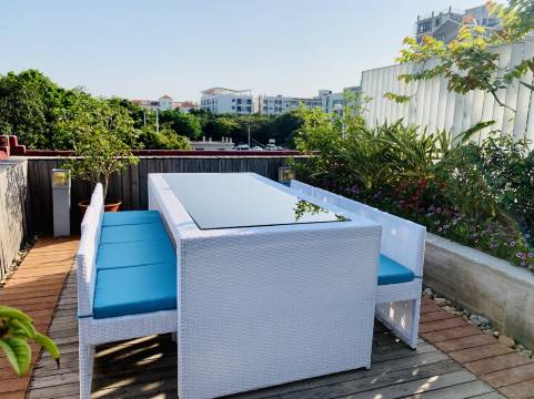 设计很棒,楼顶庭院很好。建议房间安个布帘,既可以夜间挡一点儿空调冷气不必要的外出,也可以天亮以后挡一点儿光。老板能够灵活应对实际情况,加分!