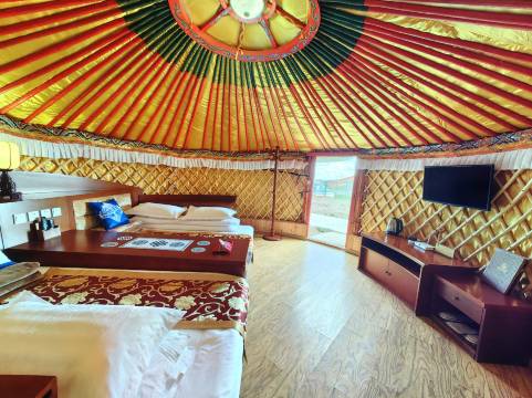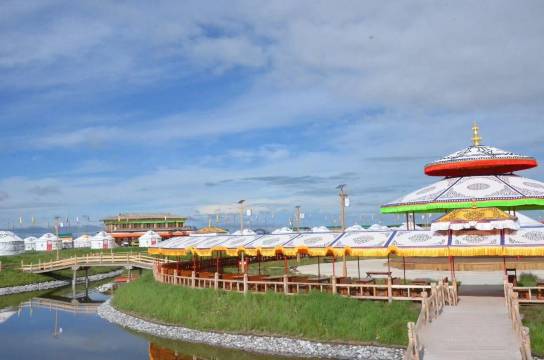酒店以绿水环绕的湖心广场为中心,广场边缘设有环形亭廊,四周依次散落着310顶白色帐篷,帐篷内设展览厅、豪华会议厅、特色餐厅等。在这里您可近距离感受到一个古老民族勤劳勇敢、开拓进取的精神,探索了解他们的佛教、游牧、马背等文化。
