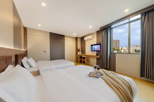 强烈推荐这家酒店。全新装修改造。床上用品都是新的用品,装修风格简约舒适风,看起来很舒服。采用的都是智能语音声控,巨幕投影。体验感升级了。性价比很高。房间空间大,特别是卫生间真的不错,够大。很方便。前台老板服务很热情,宾至如归。睡的舒适。近白云学院,广技师学院。附近商业美食娱乐悠闲一条街。酒店大堂很宽敞明亮。看起来大气高档。商务旅行选择这家酒店是很不错的