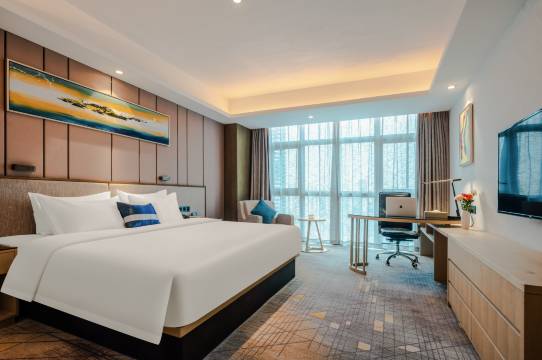 房间很好,环境很棒,楼下就是商场,有很多吃的。设施设备完善,服务态度好,环境卫生干净,睡得舒服,落地玻璃窗,视野开阔,风景好,自助早餐种类很多,好吃!