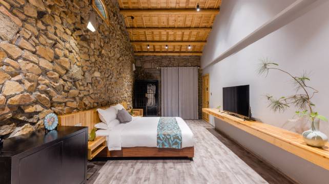 民宿在设计风格上保留了老墙的外观,在室内设施上选用高档布草和高端TOTO卫浴等,全部按高星级酒店标准,以适应现代人的起居习惯。相比清一色的钢筋混凝土建筑,花筑奢·晟境的石屋,尽显纯朴自然。