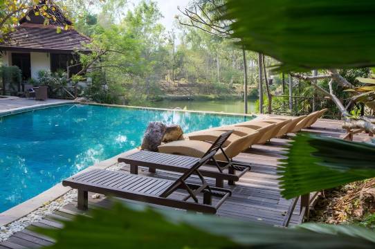 这是一个非常宽敞、环境优美的大型度假村。它确实名副其实地被称为“静修之所”,因为这里充满着一种精神氛围,拥有一座仍在使用的寺庙,以及许多可以让人感受到与自然连接的地方。虽然有些地方略显陈旧,但考虑到我入住的森林小屋的价格,性价比非常高。泳池大小适中,勉强够游泳锻炼,但并不算很大。如果淋浴水温更高、持续时间更长一些就更好了。前台告诉我可以在餐厅工作,但当我到达餐厅后,那位女士却坚持说我必须消费,这让我感到有些失望,也算是一个误会。