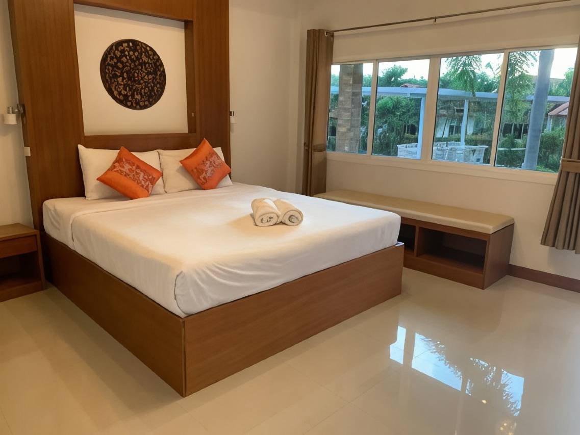 这间客房带有一个额外的房间,里面有一个大冰箱(大约一米高)、一个带保险箱的衣柜,以及一张摆放着水壶和餐具的桌子。房间很干净,床很舒服,床垫和枕头都很柔软。水管状况良好,水压和水温都很棒。酒店本身比较老旧,步行到海边大约需要20分钟。沿途有一个当地市场,出售水果和新鲜的泰国食品,非常方便。市场午后才开门。附近还有一家7-11便利店。这里的海水比海滩另一侧更好,也更深。