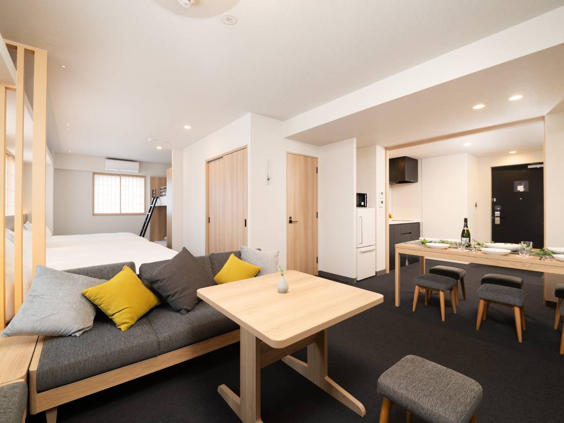 定的4人亲子房,房间挺大的,有个小餐桌,有微波炉电磁炉冰箱。一家四口住没问题。酒店位置非常好,走几分钟就是八丁崛地铁站,离银座,筑地都很近。服务也很好。