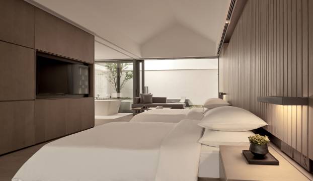 房间延续了品牌的极简风格,大面积落地窗推开便是水系与庭院景致。秋叶散落在水面上,微风经过会轻轻掀动窗帘,随手一拍都是非常松弛的度假氛围。床品柔软度很好,夜间睡眠品质非常高。迷你吧和卫浴用品选品都很精致,细节处理到位。