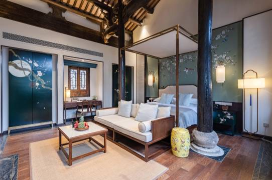 酒店一期依托23幢明清古民居,特设30套独立温泉度假美墅;二期设有以轻禅美学精心设计的客房三十余间,静谧宽阔空间中,尽显禅风闲逸与东方美学古雅。各类客房设计自然古朴,小到铜锁门环、文房四宝、盆栽摆件,大到传统大漆家具、织锦屏风,每处细节都精心打磨,每一物件都用心挑选,尽显古时大户人家优雅别致的生活情趣。