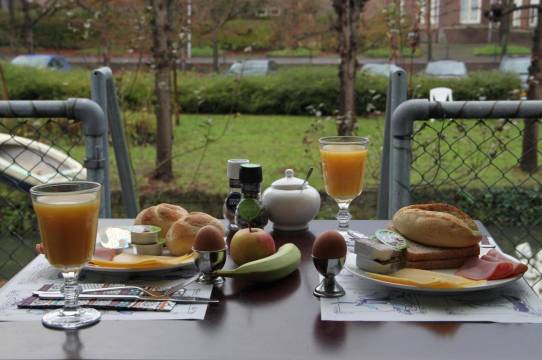 从中央车站公交站有汽车不到10分钟就到了酒店,一条安静的小路,门口除了路灯还有可爱的电子火把…其实来荷兰一周多我还挺想住民居的,周六晚上预定紧张我们选了这里,事实证明是不错的选择
