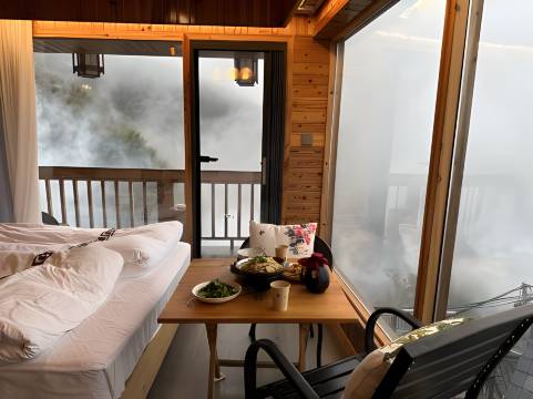 从山下爬楼梯上山比想象的轻松很多,10-15分钟,就你感觉有点累时,它就都到了。民宿在村口,很方便,村子也不大,半小时就能逛完,可能下雨可能是避开了端午第一天人多,老板给升级了房间,两扇大的落地窗,躺床上可以看云海。三楼平台观景太美了,俯瞰群山,还能看到村庄,这个角度真的很棒很值得。房间卫生间配套也不错,整体满意。另楼下外婆家菜烧的好吃。