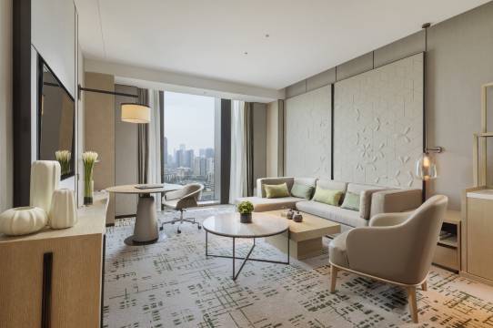 客房宽敞而雅致,立于全景落地窗前可欣赏市中心繁华夜景。跃层式行政酒廊可以让入住行政楼层的客人在繁忙的都市中,找到成都“慢生活” 的悠闲与宁静。