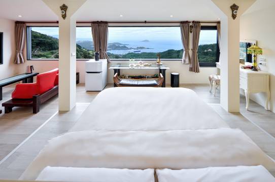 房间内大片落地窗是欣赏山海美景的绝佳住宿。