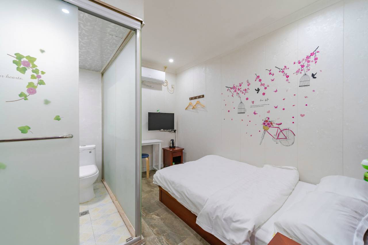 房间大,床大,设施齐全,附近热闹,网吧,饭店,超市应有尽有,吃喝玩乐都非常方便