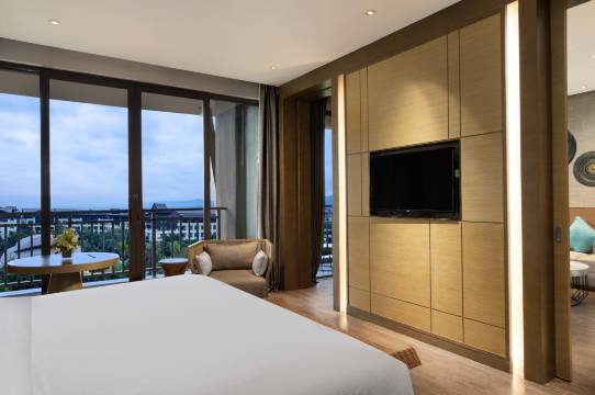 设施:我们住的是套房大床房,房间的面积很大,有单独的衣帽间梳妆台~卫生间和淋浴间是分开的,房间布局合理,住一家人也不打扰。床品很舒服,我们都睡的很好~露台看出去就是远山和绿植,令人感到心旷神怡~
