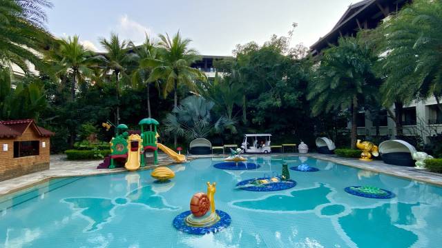 酒店藏在热带雨林里,满眼都是绿意,泳池、儿童乐园和亲子活动区一应俱全,带娃来再合适不过。房间宽敞明亮,2.03米的大床软得让人陷进去,细节里全是用心:傣式纹样的装饰、充足的备品,连窗外都能看到椰林和晚霞。