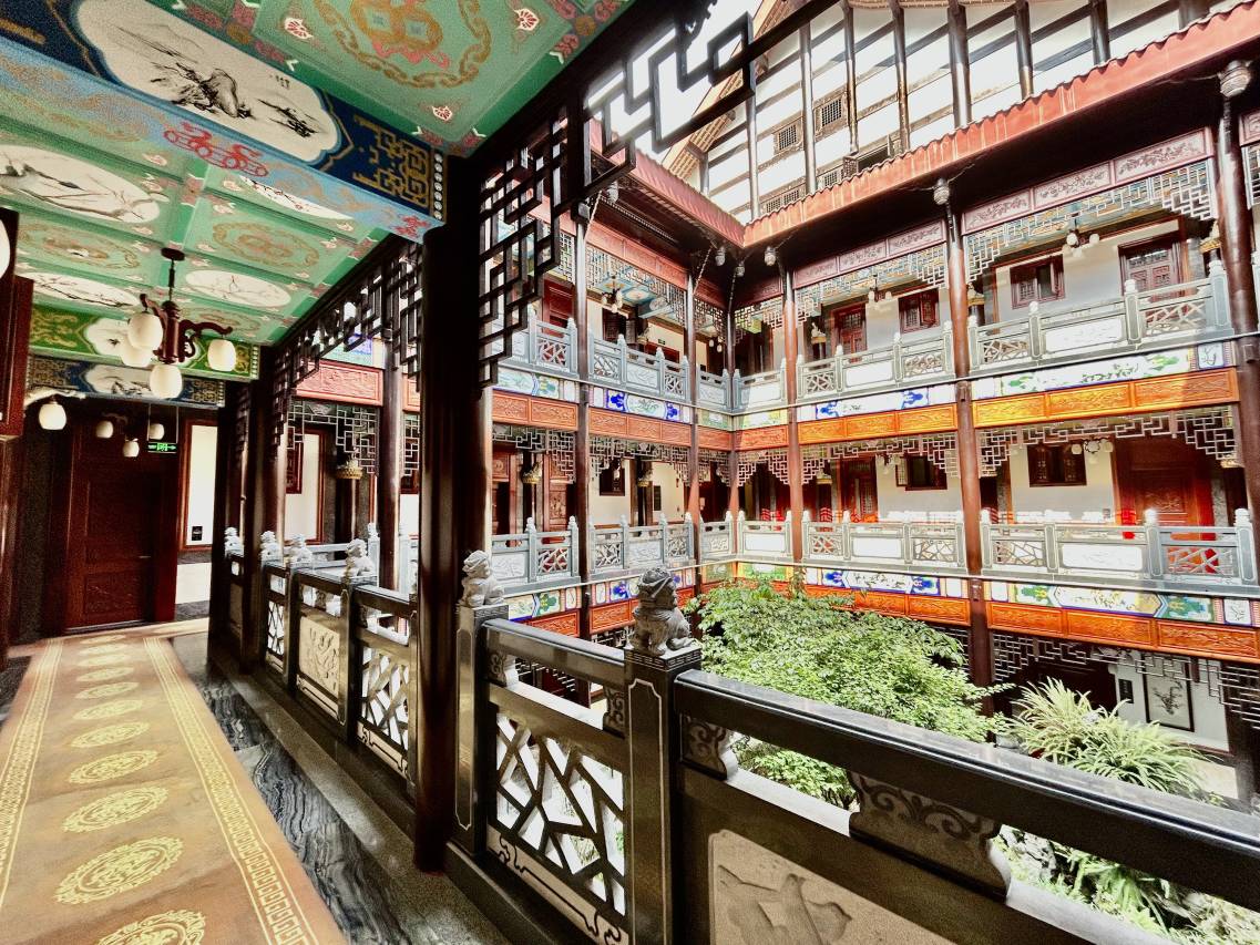 这家酒店采用传统的中式风格设计建造,从大厅到走廊包括房间都是中国传统图案,房间全木家具都是梅兰竹菊的木雕花纹,并采用传统中式建筑的榫卯结构,非常通风凉快。