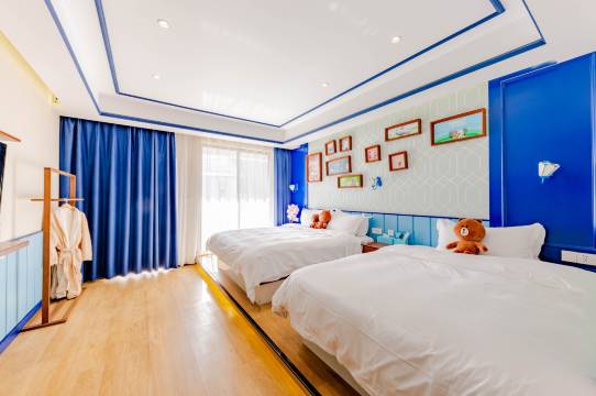 民宿共有9种美式主题风格的亲子房,床品一客一换,干净卫生;品牌卫浴,创维50寸电视,纯实木地板,格力中央空调等高端配置。阳光充足的庭院内,有小鱼戏水池、休息卡座,吊椅供客人休息,还给小朋友提供蹦床以及亲子沙堆,你能在这里喝茶聊天、看书发呆,享受难得宁静时光。