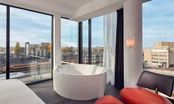 这个酒店也太好了吧,就在乌特勒支中央火车站的下面,从窗口往下看就是火车轨道,到进站口四五分钟吧,上面就有一个很大的购物商城,下面就是一个很大的自行车停车场🅿️楼下就是地铁站,打车很贵,公共交通方便,在繁华地段感觉也很安全。