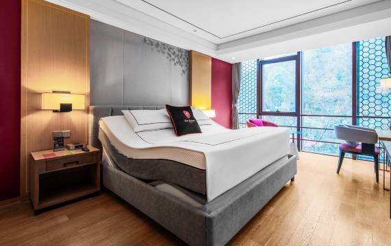 非常有特色的一家开在半山腰的酒店。先是大堂及周围的一抹红色,让人感到惊艳,欢喜;深秋的层林尽染,漫步山路,享受大自然美的馈赠。酒店服务同样值得点赞。前台小玉女士得知我们是带孙子来度周末的,非常热情地为我们升级了房型,入住至早上能看日出的套房,套房干净、宽敞、明亮,小朋友高兴极了。其次,在我们用晚餐时碰到了一些问题,向大堂经理反映后,经理及时帮忙去沟通,并在我们临走时上门送了伴手礼,真的让我们很感动。下次来苏州度周末,兰博基尼ROSSO酒店是我们的唯一选择!