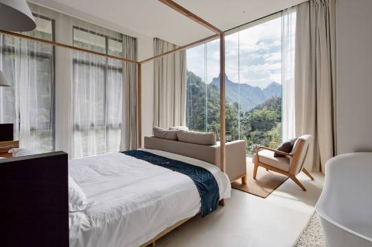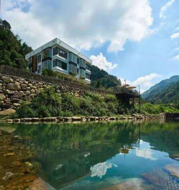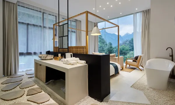 雁湖旁,芙蓉玉兔两峰包围下,时尚与乡野风碰撞,极简白色、落地玻璃窗、设计感满分的外立面造型。房间被青山绿水360度全方位的包围。满眼的自然风光都是你的,你可以尽情欣赏,自由呼吸。在温暖的阳光中感受它的温度,让人融入空间之中,放空自己,好好与自己相处,静静感受岁月的痕迹。