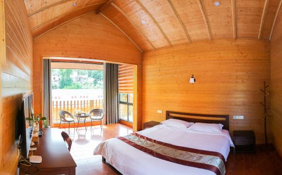 房间很漂亮舒适,亲子房,双床房的床都很大很舒适,我们带孩子漂流没经验,回来晚了节假日12点退房,老板给我们延时了,洗了个热水澡很舒服!老板回答问题很热情,孩子们都很喜欢她!木屋下面就是溪流,孩子玩耍很方便,推荐给大家!