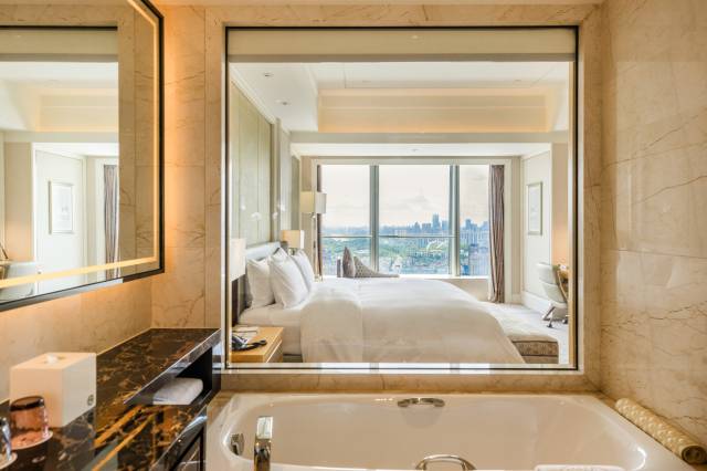 酒店浴缸放置的位置很好,有一块透明玻璃,可以在泡澡时直接看到外面的夜景,个人觉得这是一个优势,因为其他酒店放置浴缸的地方都没有玻璃,看不到外面,会显得比较压抑,但是这个酒店没有这个问题。房间内唯一缺点就是玻璃擦的不是特别干净,以及窗帘不是电动,但是都是小问题,对我来说