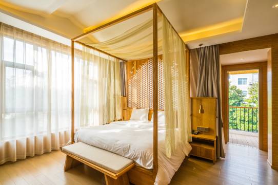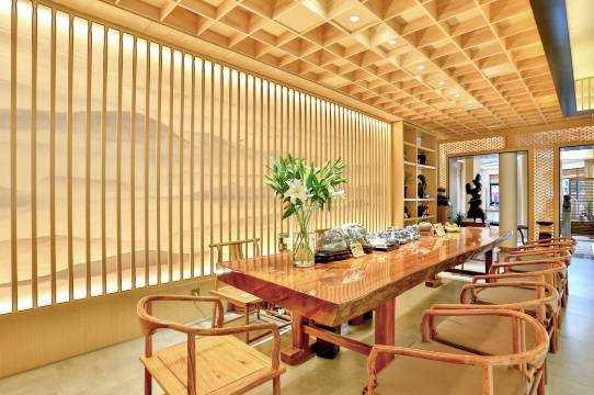 半蜗中间围着一个院子,将自然大美引入院子,将禅意美学融入院子,在含蓄节制的空间中,感受一番自然韵律,寻一番生活本真,一房一院,安抚疲惫。为了客人更好的入住体验,民宿在酒店用品选择上精益求精、不吝成本。每间客房均配置全语音控制,并特别定制了全套新中式风格实木家私,寝品选用希腊品牌COCO-MAT全套睡眠用品,床垫所有原材料均属纯天然,采用分体式结构设计,还可根据个人需求选择适合自己的软硬度。