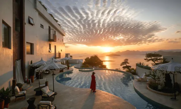 一家很有设计美感的的民宿。这次经过霞浦天气比较阴沉,但在拾间海停留的肘光弥补了这个遗憾。无论是在居住的水院还是拾间海的中餐厅、西餐厅、咖啡厅,映入眼帘的都是漂渺的山水画卷,充满艺术气息的建筑风格、室内装潢、庭院布局、无边泳池让我们感受到身心放松的度假氛围,还拍出了不少人与山水交融的大片。服务也很贴心,无论店长还是管家、咖啡厅的帅哥都非常热情、周到。以前旅行更倾心于住酒店,拾间海从设计到服务让我对民宿的印象焕然一新。