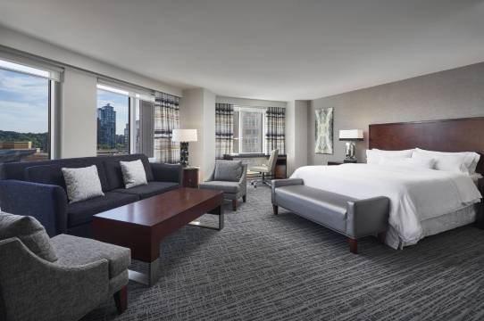 有 319 间客房提供冰箱和平板电视;您定能在旅途中找到家的舒适。您的加厚层卧床备有羽绒被。有线频道可满足您的娱乐需求;此外还提供收费有线和无线上网。配备淋浴/盆浴组合的私人浴室提供大花洒淋浴喷头和**洗护用品。