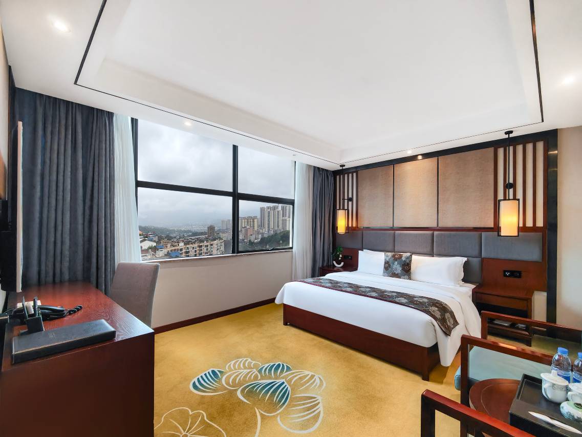 入则宁静,出则繁华,酒店位于云南省昭通市镇雄县南台街道办事处南广社区龙腾大道上段,20层的摩天大厦在镇雄县城格外抢眼。酒店毗临龙腾广场、亿联国际商贸城、观澜湖购物中心、赤水源森林湖公园。开车到南部汽车站仅10分钟左右。距离以勒高铁站开车约需三、四十分钟。商务、休闲、购物、等十分便捷。 酒店面积20000余平方米,建筑设计独具匠心,将艺术元素渗透到每个细节的设计当中。