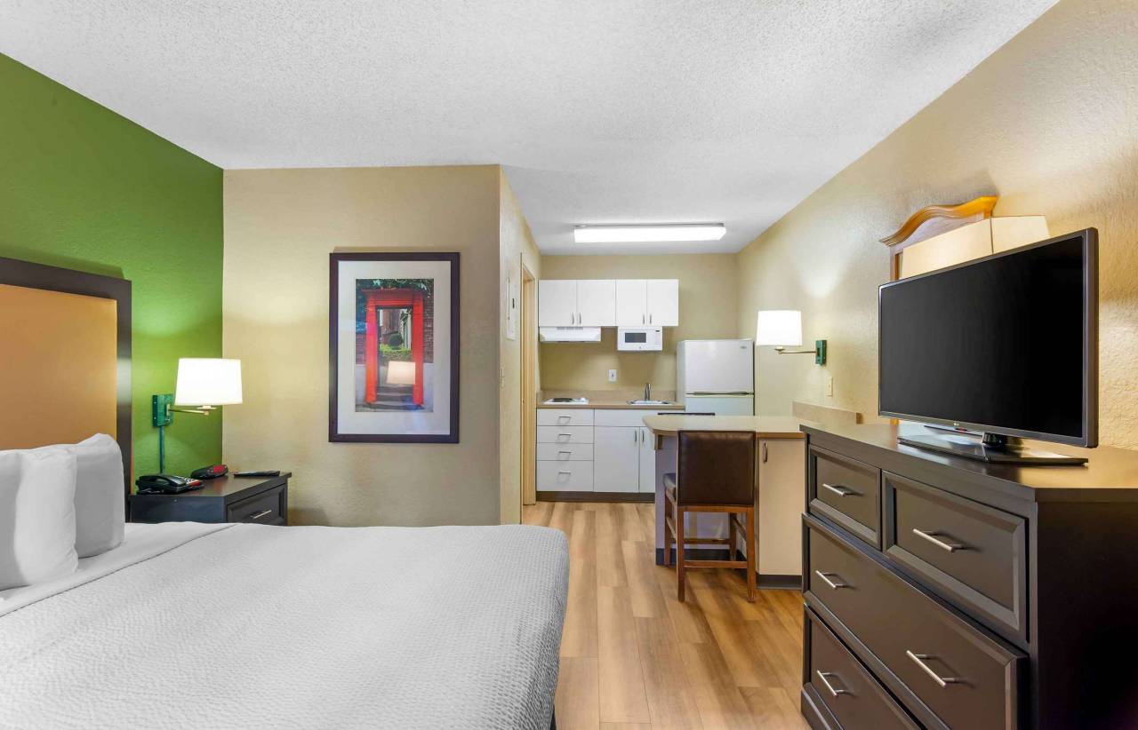 126 间空调客房提供备有冰箱和炉灶的厨房;您定能在旅途中找到家的舒适。带有有线频道的 50 英寸平板电视可满足您的娱乐需求;同时提供免费无线网络,方便您与朋友保持联系。便利设施包括电话,以及书桌和微波炉。